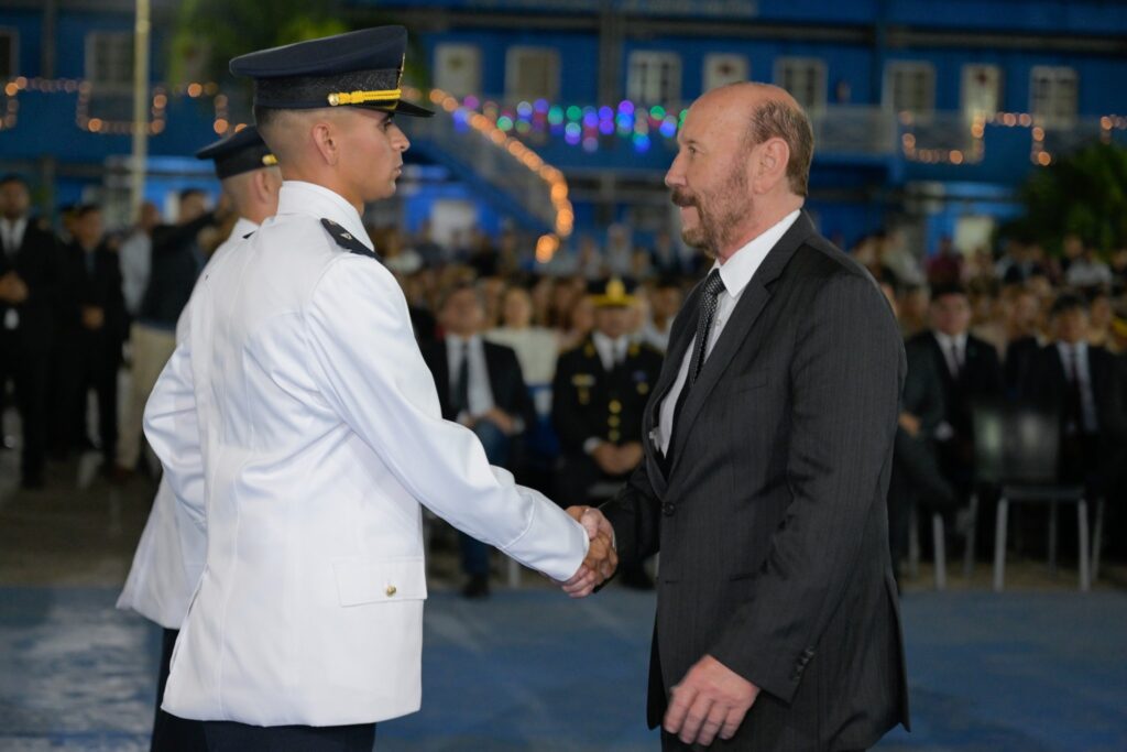 Y concluyó con el agradecimiento al “acompañamiento permanente” del ministro de Gobierno, Justicia, Seguridad y Trabajo, Jorge Abel González “fundamental para el éxito de este proyecto pedagógico”; al jefe y subjefe de la Policía por “el invaluable apoyo y colaboración con esta casa de estudio, con un liderazgo caracterizado por la confianza y la constante directiva, fundamental para la formación de estos nuevos funcionarios públicos”, y a los profesores e instructores “que sembraron la semilla del conocimiento y los valores en estos cadetes”.