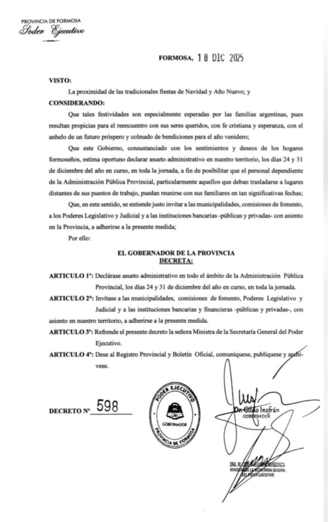 De esta manera, el Decreto N°598/25, sostiene que las tradicionales fiestas de Navidad y Año Nuevo son “especialmente esperadas por las familias argentinas, pues resultan propicias para el reencuentro con sus seres queridos” y que “este Gobierno, consustanciado con los sentimientos y deseos de los hogares formoseños, estima oportuno declarar asueto administrativo en nuestro territorio los días 24 y 31 de diciembre del año en curso”.