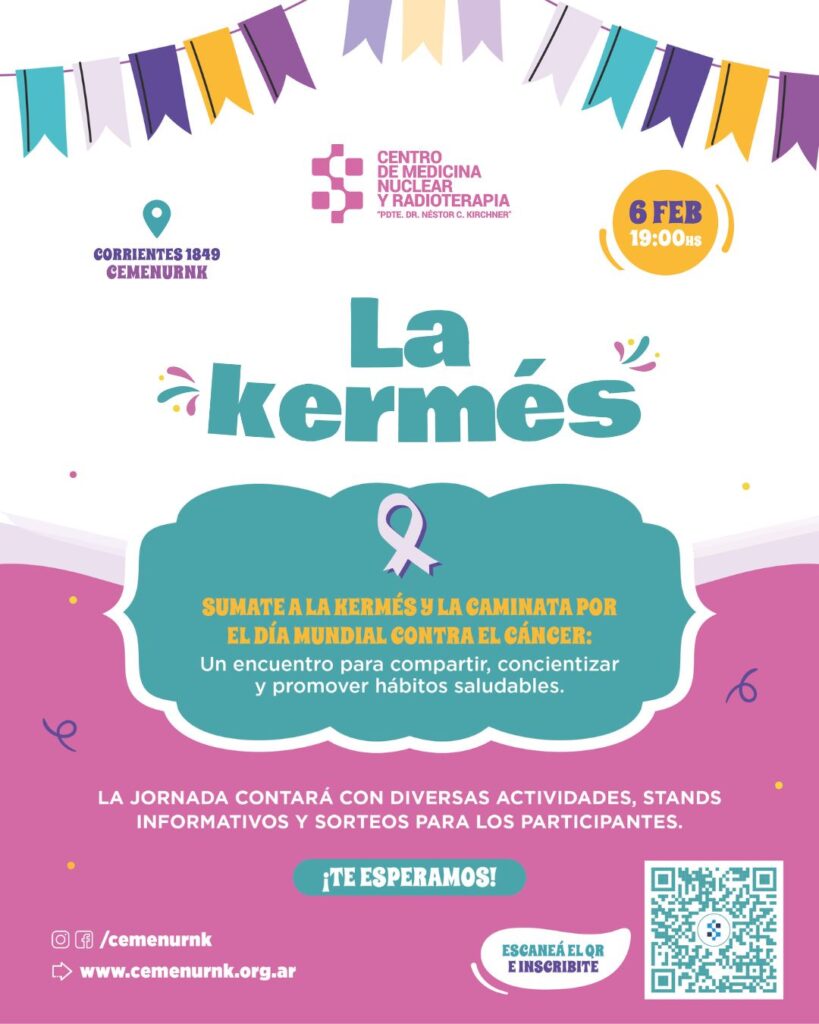 El Centro de Medicina Nuclear y Radioterapia “Pdte. Dr. Néstor C. Kirchner” (CEMENURNK) invitó a un encuentro para compartir, concientizar y promover hábitos saludables. La jornada contará con diversas actividades, stands informativos y sorteos para los participantes, en el marco de una gran kermés.